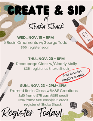 Sip & Create Framed Resin Class with M&E Creations on Sunday, November 23rd from 2pm-4pm