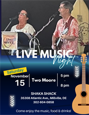 Live Music Performance by Two Moore at Shaka Shack on Saturday, November 15th from 5-8pm.